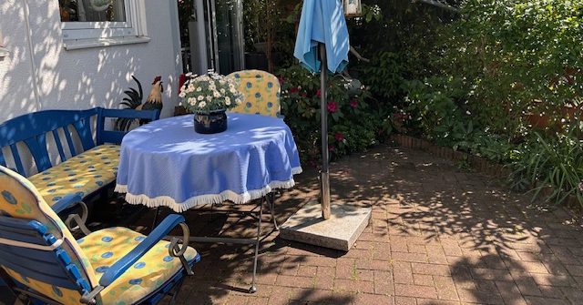 In der Morgensonne frühstücken können Sie in unserem überdachten Biergarten auf der Ostseite.
